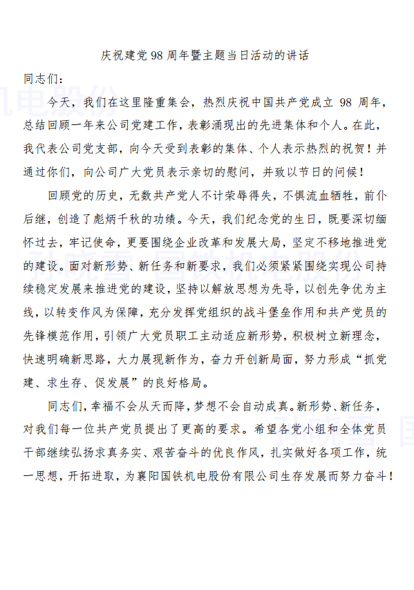 今年是建黨98周年。7月1日,襄陽國鐵機(jī)電股份有限公司以傳承紅色基因、弘揚(yáng)革命精神展開了紀(jì)念活動(dòng)。